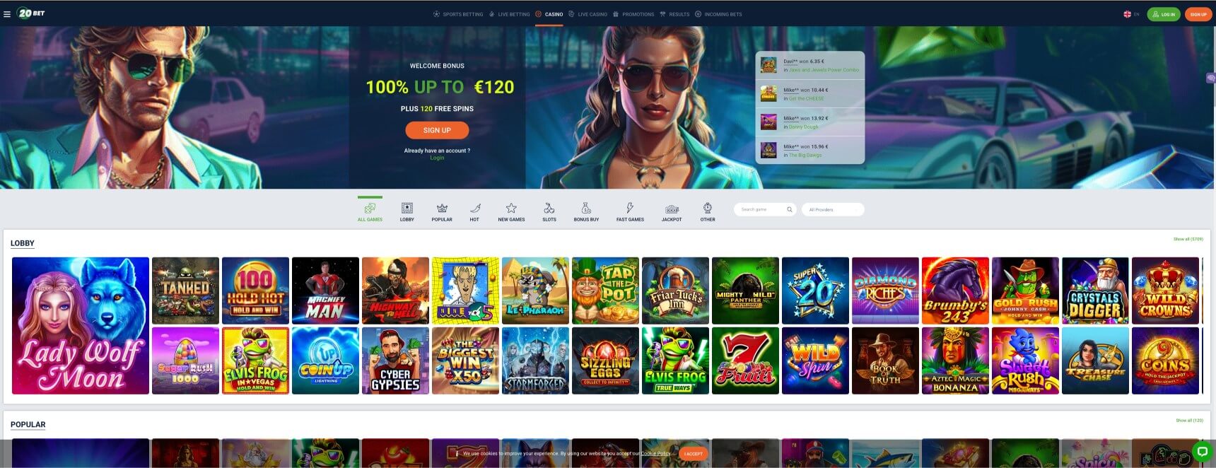 20Bet welcomes new players with a 100% up to €120 + 120 free spins bonus. You can claim this bonus with €20 or more, but you have to roll over the bonus amount and free spins winnings 50x to claim your winnings. Additionally, you can claim between 20 to 100 free spins on Mondays for depositing €20 or more. On Fridays, 50% up to €100 + 50 free spins can be gotten on depositing €20 or more. It also offers a VIP program with level-up bonuses reaching €100,000.